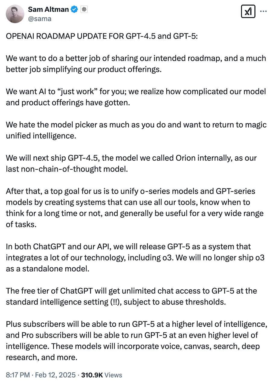 Сэм Альтман подтверждает, что GPT-5 будет полностью бесплатным и безлимитным для всех пользователей. Это значит, что мы на пороге новой эры в обработке данных и взаимодействии с языковыми моделями.